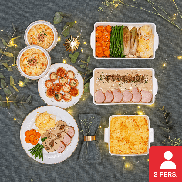 12 aperitiefhapjes, 2 visgratins, ± 600 g gebakken varkenshaasje in archiducsaus, ± 500 g aardappelgratin, 1 ovengroenteschotel