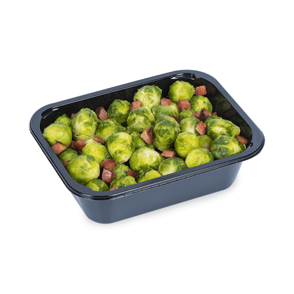 Ingrediënten | spruiten, breugelspek (varkensvlees, zout, varkensgelatine, varkenseiwit, azijn, kruiden, look, MOSTERD, aroma (SOJA), rookaroma, specerijen (MOSTERD, SELDERIJ), conserveermiddel (E250), zuurteregelaar (E261, E326), stabilisator (E450, E451), smaakversterker (E621)), zout, specerijen, zuurteregelaar (E500). 112g spruiten, 5g breugelspek gebruikt voor 100g eindproduct. |