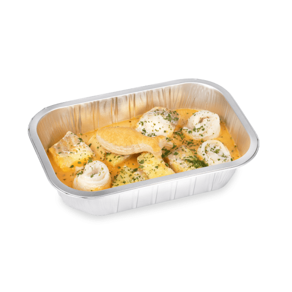 zalm, kabeljauw, grijze garnalen, prei, wortel, ch...