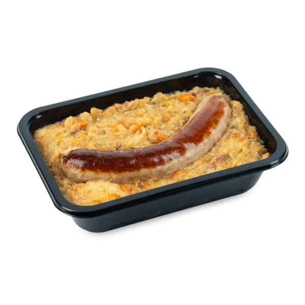 gebakken worst (varken, rund), aardappel, wortel, ajuin, raap, prei, knolselder, spruit, groene kool