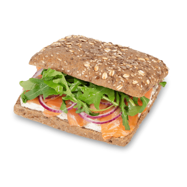 gerookte zalm, kruidenkaas, rucola, rode ajuin