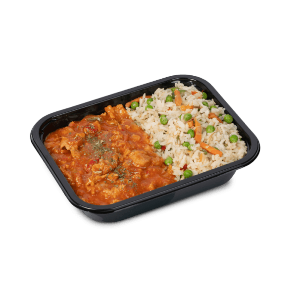 gebakken kippenreepjes curry, rijst met groenten, gestoomde wokgroenten, rode currysaus
