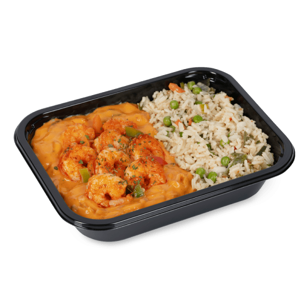 gebakken scampi, rijst met groenten, gestoomde wokgroenten, rode currysaus